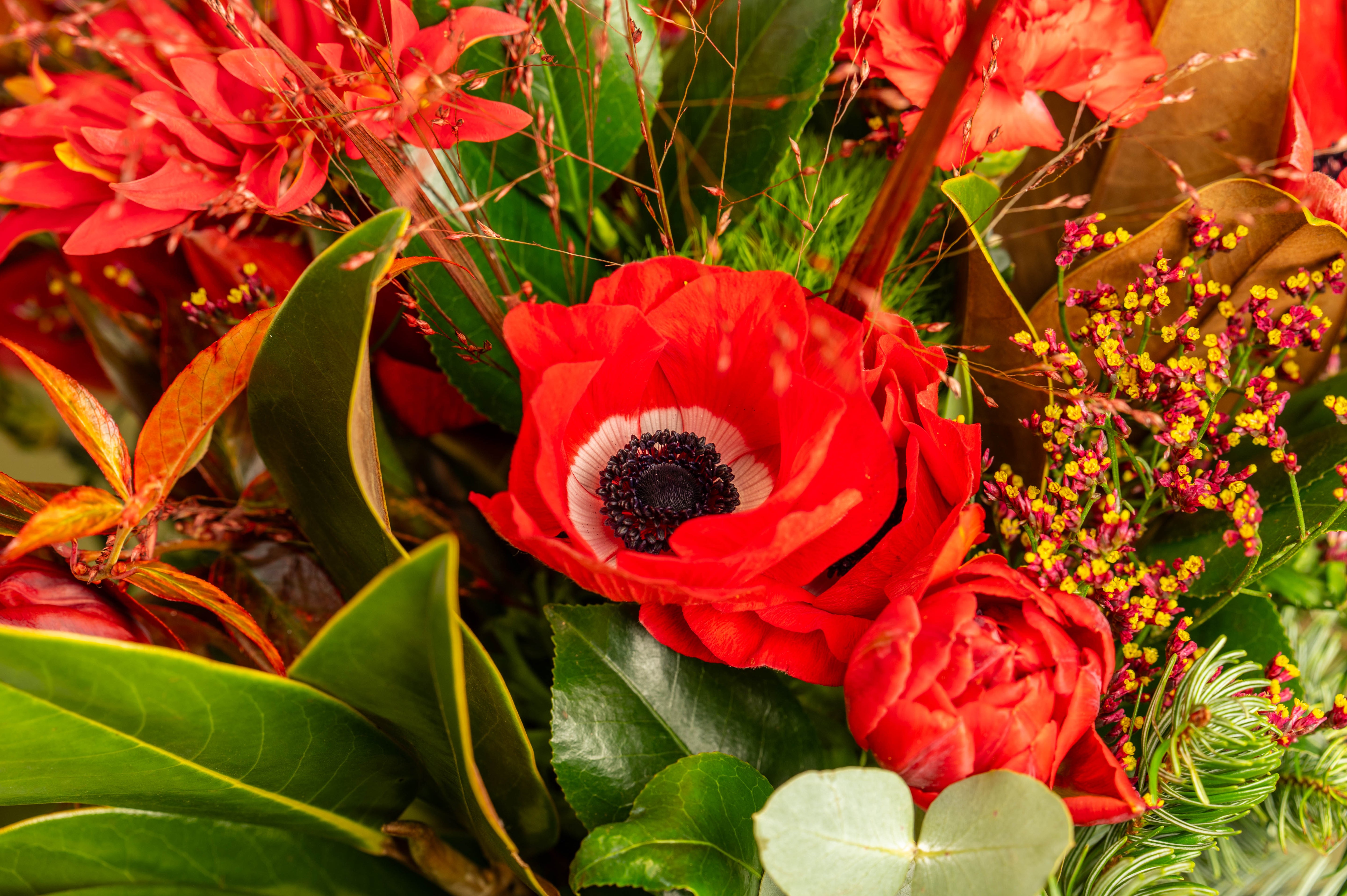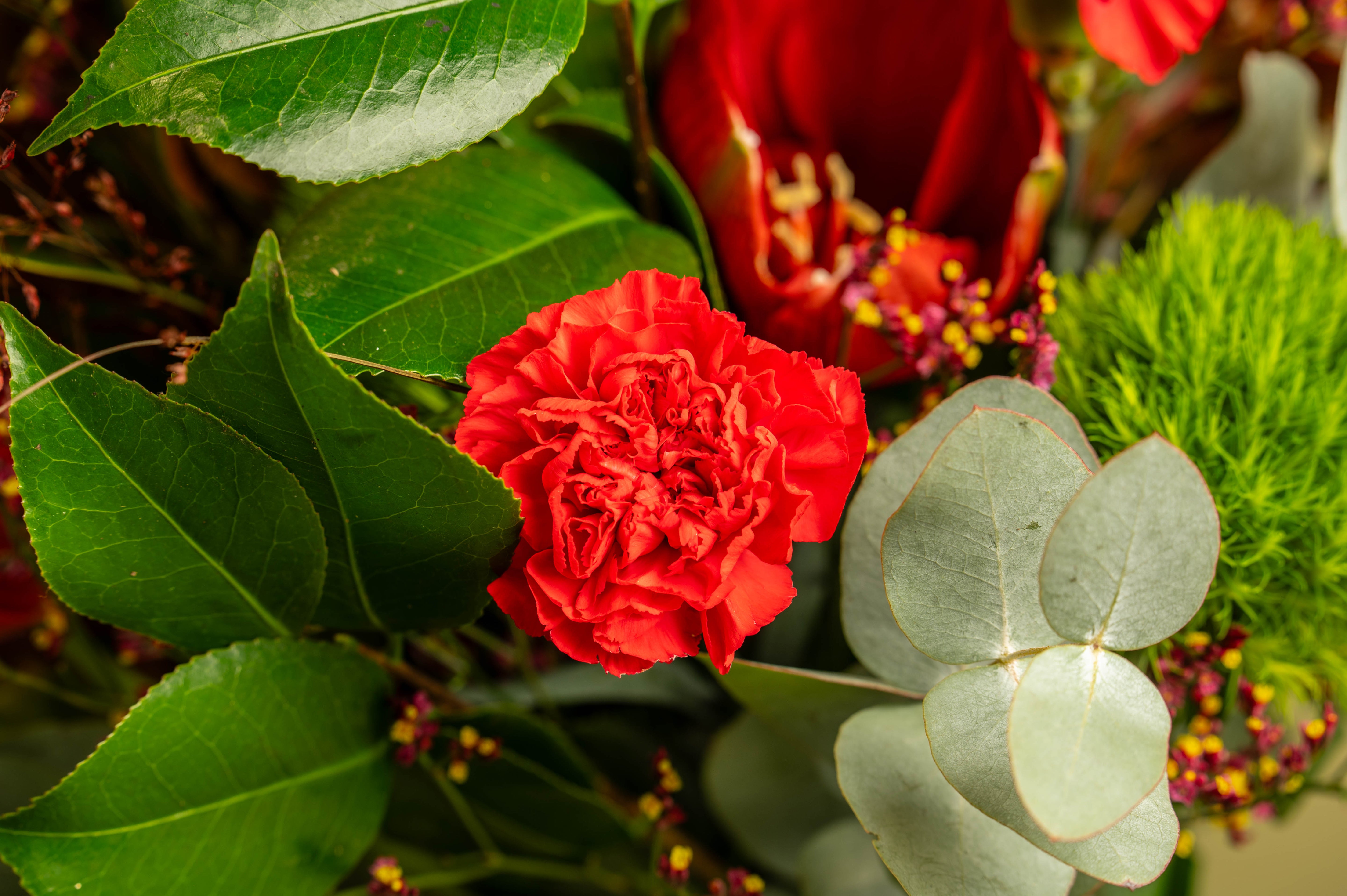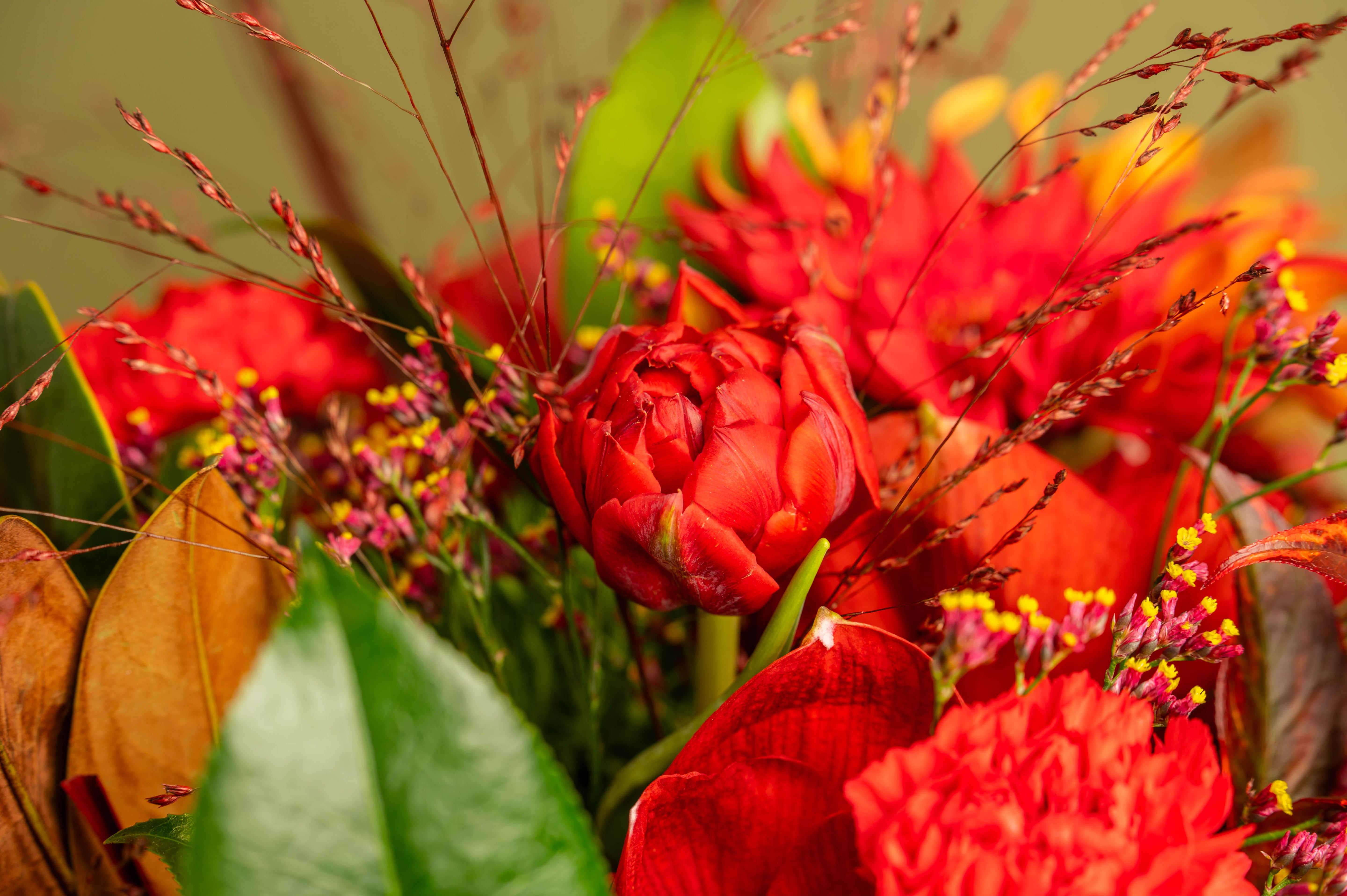 Une boule d'amour que ce bouquet éclatant où se mêlent tulipes, œillets, magnolia, gerbera camélias, éclairés de quelques feuillages odorants. C'est rouge profond comme le cœur de celui qui le reçoit et peut-être aussi de celui qui le donne.