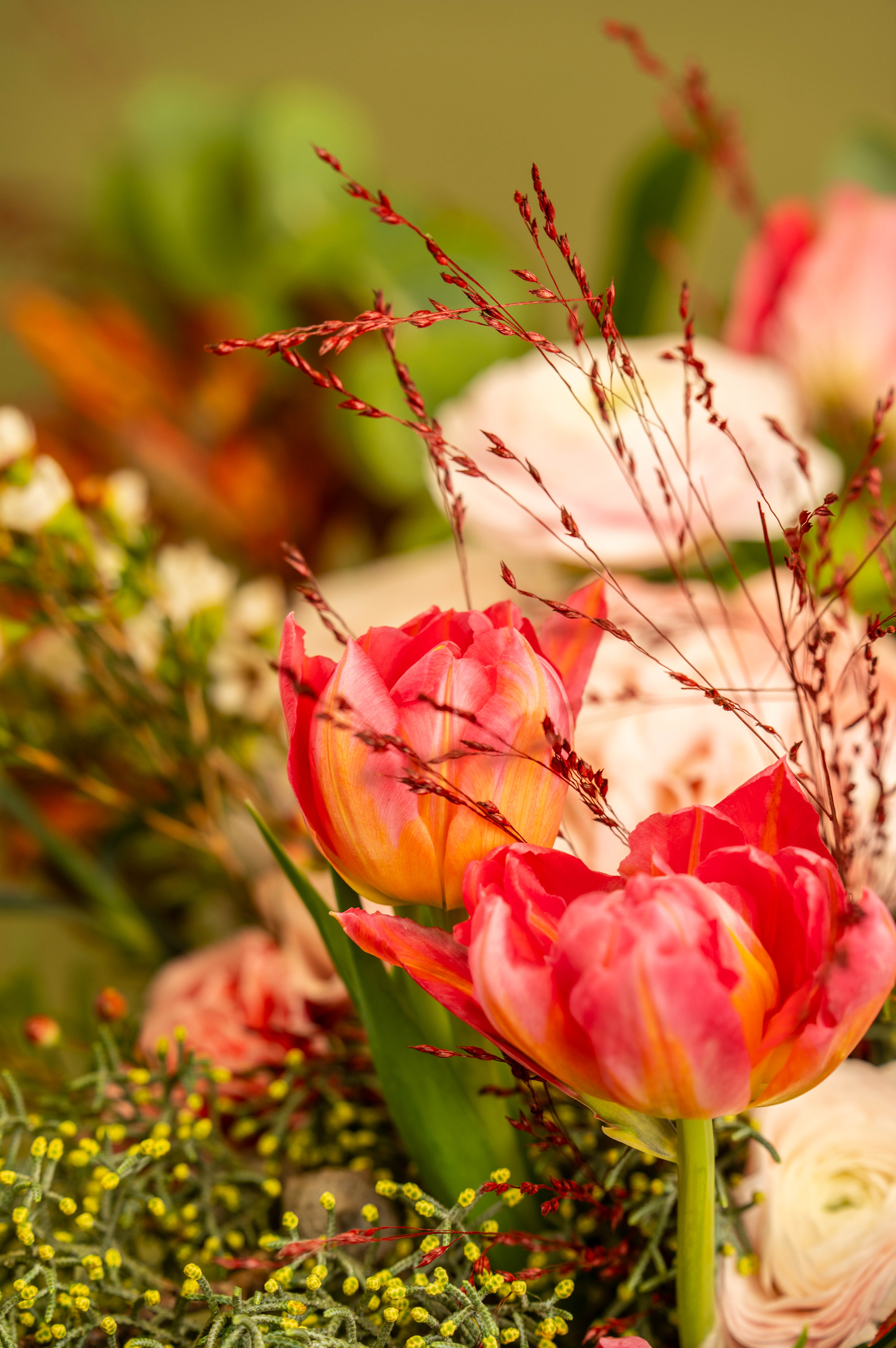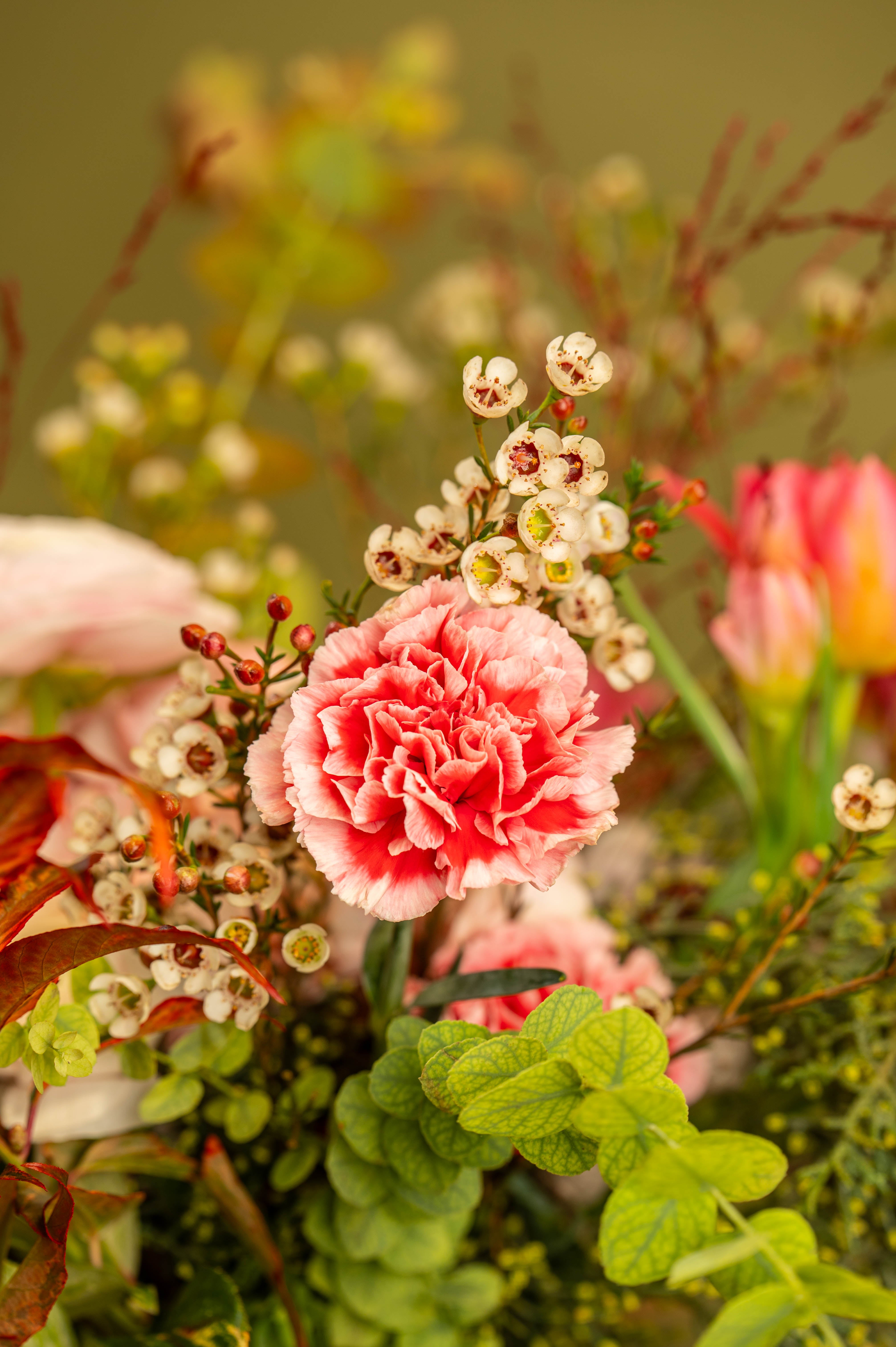 Fleurs : renoncules, tulipes, œillets, anémones, wax flowers, magnolia