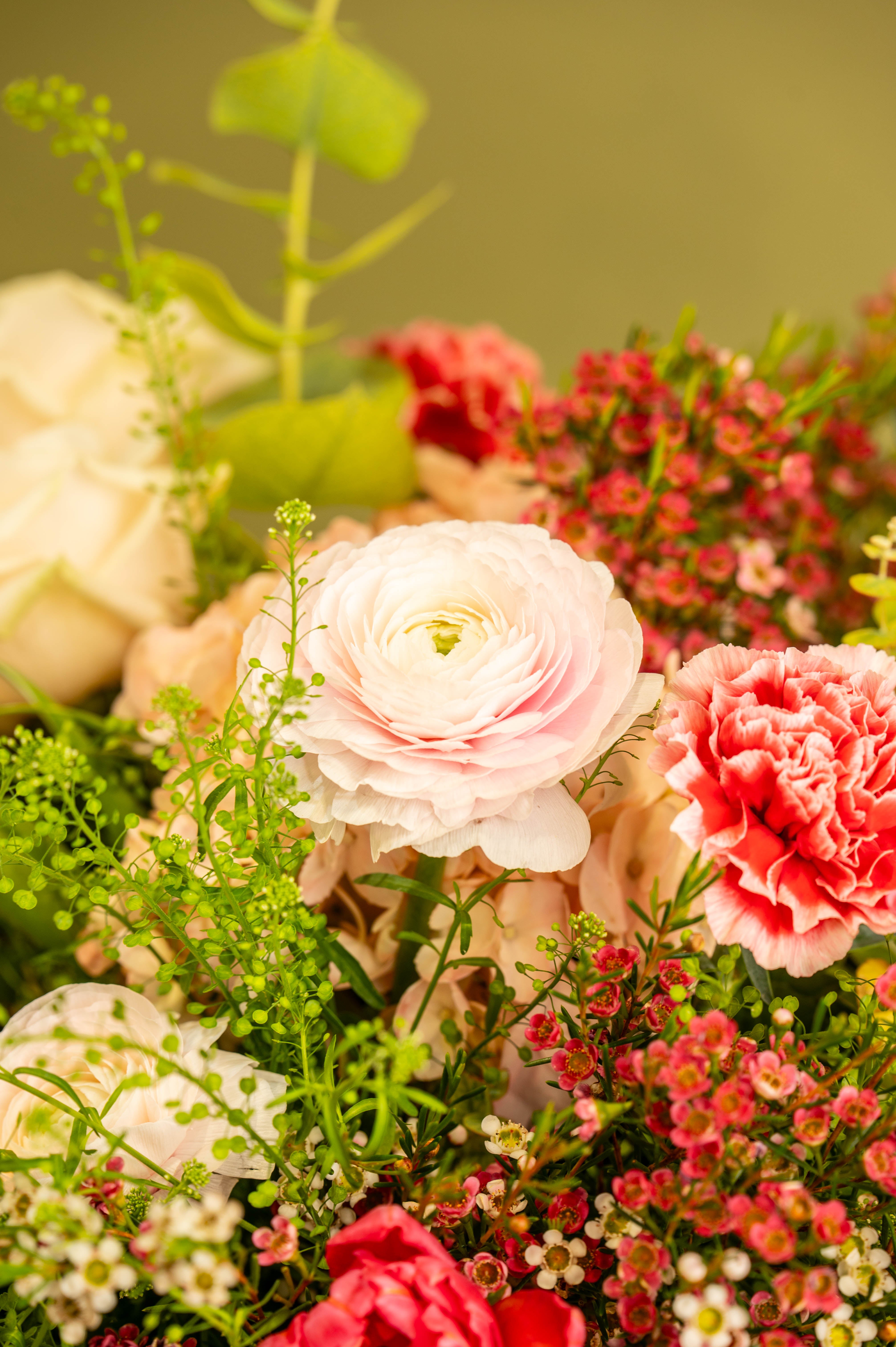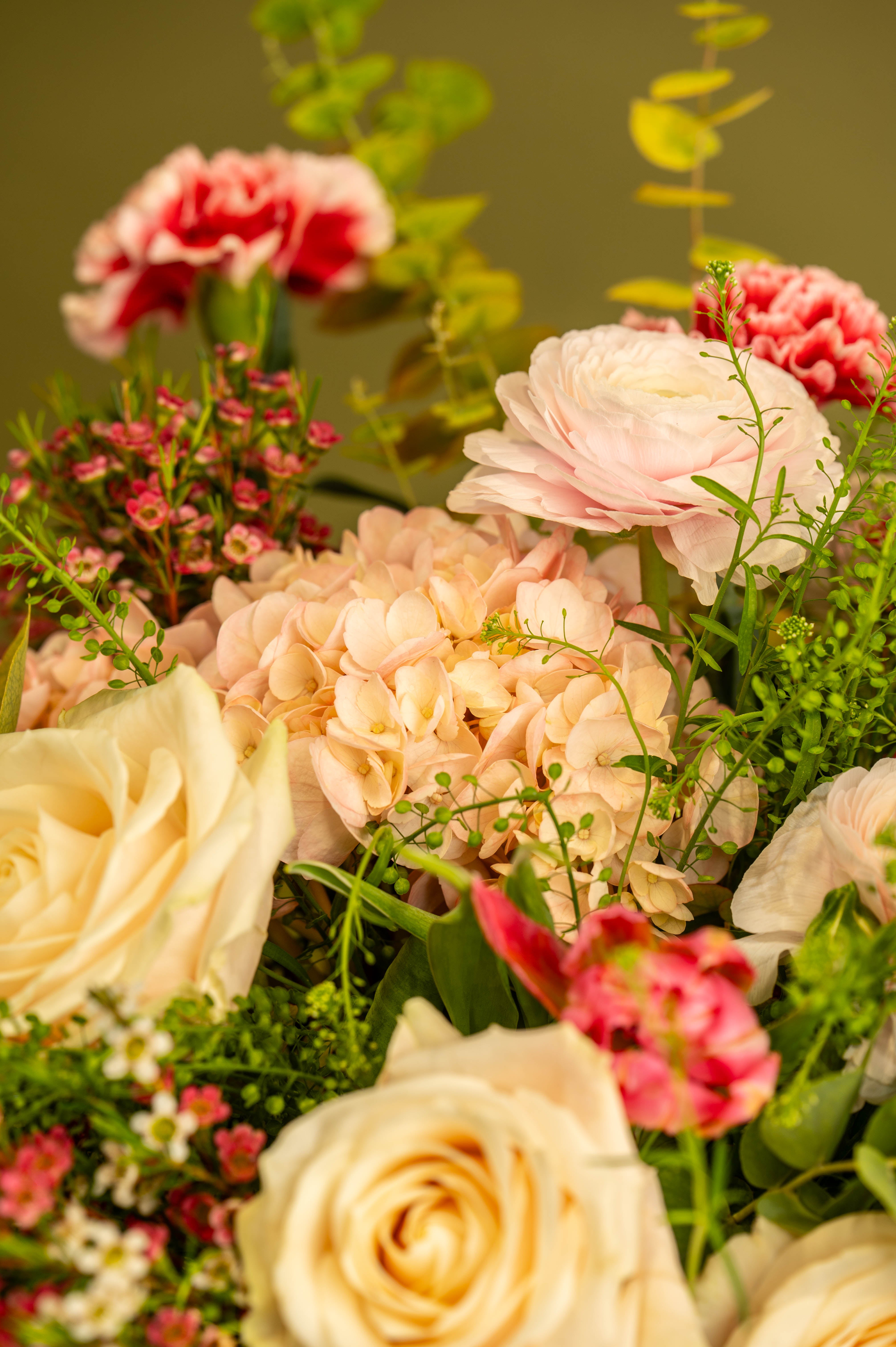 Fleurs : rose, œillet, thlaspi, tulipes, wax flowers, eucalyptus